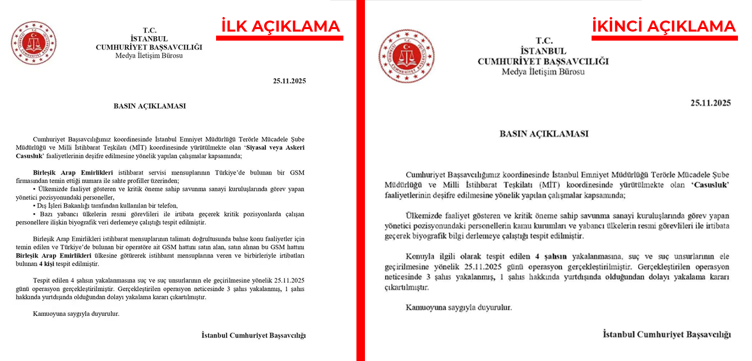 NE OLMUŞTU?İstanbul Cumhuriyet Başsavcılığı, Birleşik Arap Emirlikleri istihbaratı adına Türkiye’de kritik pozisyonlardaki isimler hakkında biyografik veri toplamaya çalışan 4 şüpheliden 3’ünün yakalandığını, 1 kişi için yurt dışında olması nedeniyle yakalama kararı çıkarıldığını açıklamıştı. Savcılık yaptığı operasyon duyurusunu önce silmiş, ardından “Birleşik Arap Emirlikleri” kısmını çıkarıp yeniden paylaşmıştı. Savcılık tarafından yapılan açıklamada, “Basın duyurusu yapılan casusluk soruşturması ile ilgili güvenlik kaynaklarımızdan alınan bilgilere göre şüphelilerin, Birleşik Arap Emirlikleri ülkesiyle herhangi bir irtibatının bulunmadığı anlaşılmıştır” denilmişti.