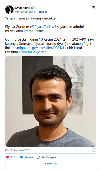 “SUÇ BUNUN NERESİNDE”“Yahu suç ise sermaye piyasası kurulu faaliyet raporunda bu resmi paylaşmasın. Yahu suçsa adalet bakanı kendi sitesinde başsavcının resmini paylaşmasın” diyen Avukat Eyyup Akıncı, Peküs’ün fotoğrafını paylaşarak şunları kaydetti:
