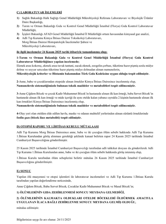"Adli Tıp Kurumu Morg İhtisas Dairesince anne, baba ve iki çocuğun ölüm sebebi hakkında Adli Tıp Kurumu 1. İhtisas Kurulu’ndan görüş alınması gerektiği yönünde kanaat belirten rapor, 24 Kasım 2025 tarihinde İstanbul Cumhuriyet Başsavcılığı’na gönderilmiştir. 25 Kasım 2025 tarihinde İstanbul Cumhuriyet Başsavcılığı tarafından adli tahkikat dosyası da gönderilerek Adli Tıp Kurumu 1. İhtisas Kurulu’ndan anne, baba ve iki çocuğun ölüm sebebi hakkında görüş istenmiş olup, 1. İhtisas Kurulu tarafından ölüm sebeplerini belirtir mütalaa 26 Kasım 2025 tarihinde İstanbul Cumhuriyet Başsavcılığı’na gönderilmiştir. Yapılan ölü muayenesi ve otopsi işlemleri ile laboratuvar incelemeleri ve Adli Tıp Kurumu 1. İhtisas Kurulu tarafından yapılan değerlendirme neticesinde; Anne Çiğdem Böcek, baba Servet Böcek, çocuklar Kadir Muhammet Böcek ve Masal Böcek’in; Ölümlerinin gıda zehirlenmesi sonucu meydana gelmediği, Ölümlerinin, kalmakta oldukları otelde böcekleri öldürmek amacıyla uygulanan ilaca bağlı zehirlenme sonucu meydana gelmiş olduğu mütalaa edilmiştir"
