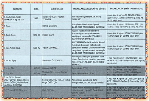 E. Kıdemli Başçavuş Sadullah Erdem Adıyaman'da bulunan Menzil köyünü ziyaret ettiği için 2000 yılında, E. Albay Alattin Türker'in eşi ve kızı Meral ile Reyhan Türker tesettürlü kıyafet giydikleri için, E. Başçavuş, Kemal Şaşmaz Nakşibendî tarikatını ziyaret ettiği için, E. Astsubay Yalçın Dönmez Adıyaman Menzil köyünü ziyaret ettiği için, E. Tabip Binbaşı Nuri Levent Özlan Adıyaman Menzil köyünü ziyaret ettiği için, E. Hava Albay Ahmet Kurt Kadiri Tarikatı ile irtibatlı olduğu için, E. Hava Kd. Başçavuş Selahattin Öztokatlı Almanya'da bir İslami cemaate mektup gönderdiği iddiasıyla 2001 yılında, E. Hava Pilot İsmail Öğütçü'nün eşi Feriha ile kızı Müge Öğütçü Adnan Oktar gubu ile görüştüğü gerekçesiyle 2003 yılında, E. Pilot Albay Hüseyin Öğütler'in damadı Hayati Çalkı Nakşibendî tarikatını ziyaret ettiği gerekçesi ile 2004 yılında süresiz yasaklanırken; E. Tabip Albay Nevzat Tarhan ise Vakit gazetesinde 2009 yılında yazı yazdığı gerekçesiyle 2 yıl boyunca askeri tesislere girişleri yasaklanmış. E. Tank Başçavuş Hasan Sarı ise Fazilet Partisi'nden belediye başkan adayı olduğu ve seçildiği için 2001 yılında “süresiz” olarak yasaklılar listesindeki yerini almış.