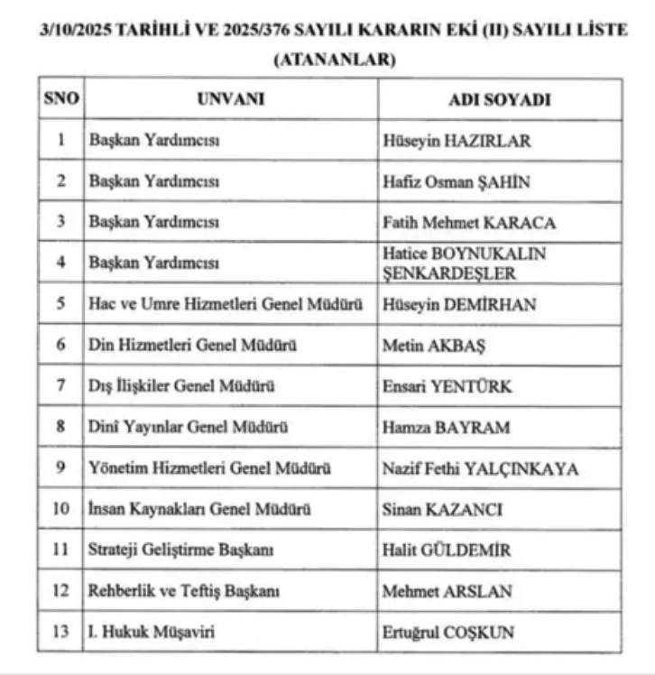 Cumhurbaşkanı Recep Tayyip Erdoğan’ın imzasını taşıyan karar doğrultusunda, Hüseyin Hazırlar, Hafız Osman Şahin, Fatih Mehmet Karaca ve Hatice Boynukalın Şenkardeşler başkan yardımcılığı görevine getirildi. Ayrıca Hüseyin Demirhan, Metin Akbaş, Ensari Yentürk, Hamza Bayram, Nafiz Fethi Yalçınkaya, Sinan Kazancı, Halit Güldemir, Mehmet Arslan ve Ertuğrul Coşkun genel müdür olarak atandı.