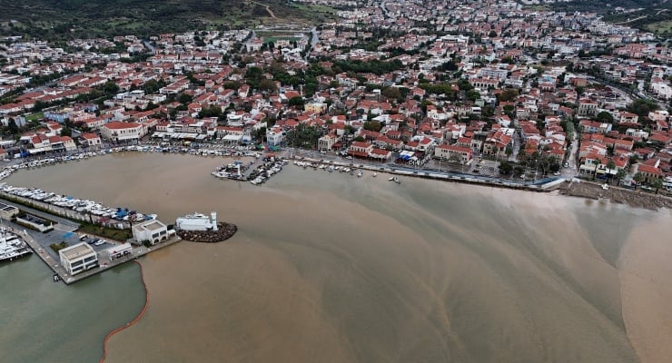 Yenifoça sahilinde su taşkını nedeniyle denizin rengi de değişti.