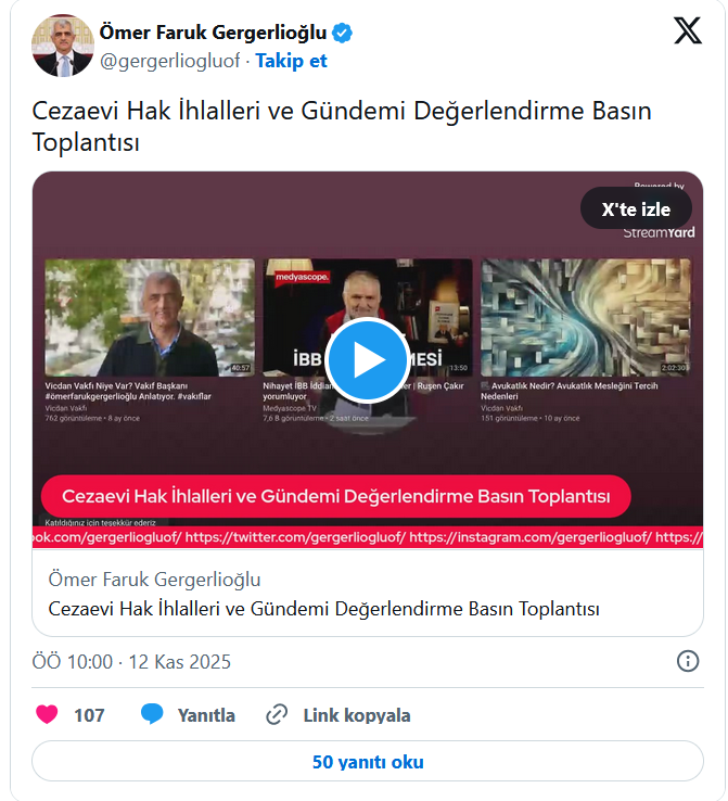 Gergerlioğlu duyurdu: Koğuşta bilincini kaybeden köfteci Abdullah amca, ölümün eşiğinde. Tekirdağ’da Hizmet Hareketi'ne yönelik davalar kapsamında 7 yıl 6 ay hapis cezası alan ve dosyası Yargıtay tarafından onandığı için 26 Şubat 2025’te tutuklanan 72 yaşındaki Abdullah Tırpan’ın, 3 Kasım’da koğuşta bayılarak bilincini kaybettiği, acile kaldırıldığı, daha sonra ise tekrar cezaevine götürüldüğü öğrenildi.