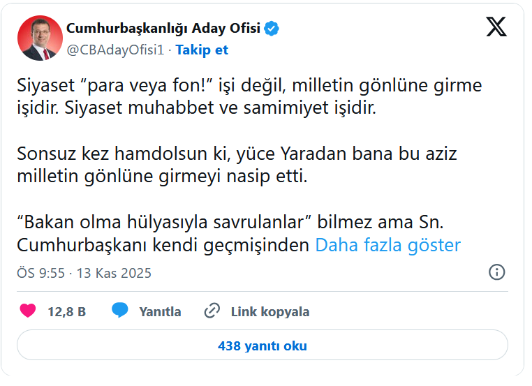 Yeni X hesabından İBB iddianamesinde kendisine yöneltilen suçlamalarla ilgili olarak “siyaset para veya fon işi değil” diyen İmamoğlu, ‘‘Tek yüzükle yola çıkan değil, servetleriyle yola çıkanlar Cumhurbaşkanı olurdu.’’ dedi.