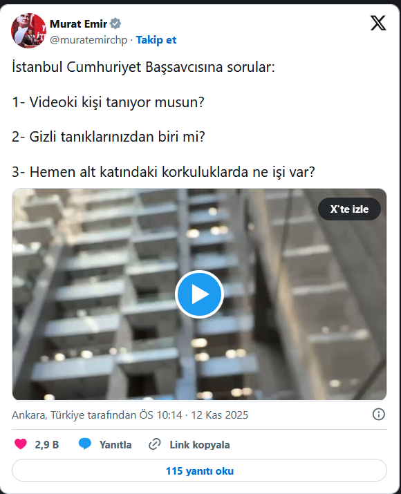 CHP Grupbaşkanvekili Murat Emir, CHP Genel Başkanı Özgür Özel'in Sultanbeyli mitinginde "Çınar" kod adlı gizli tanığın intihar girişiminde bulunduğu iddiasına dair video paylaştı ve İstanbul Cumhuriyet Başsavcısı'na 3 soru sordu. Emir, sosyal medya paylaşımında "Videoki kişi tanıyor musun? Gizli tanıklarınızdan biri mi? Hemen alt katındaki korkuluklarda ne işi var?" sorularını yöneltti.