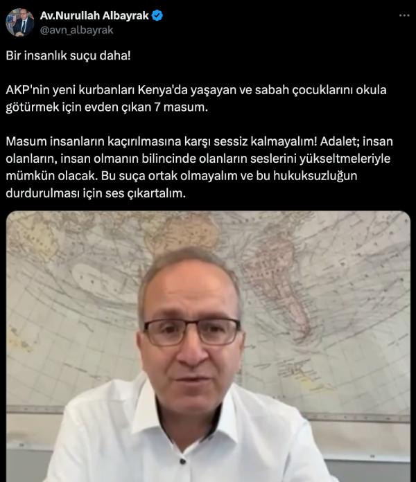 Avukat Nurullah Albayrak da Kenya’da kaçırılan 7 kişi hakkında sosyal medya platformu X’teki hesabından bir mesaj yayınlayarak, insanları bu konuda sessiz kalmamaya davet etti.