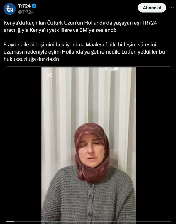 Kenya’da kaçırılan Öztürk Uzun’un Hollanda’da yaşayan eşi TR724 aracılığıyla Kenya’lı yetkililere ve BM’ye seslendi: