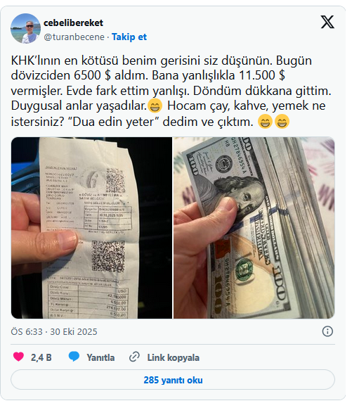KHK’lı öğretmen, döviz bürosunun fazladan verdiği 5 bin doları iade etti: Biz çalmayız, alınanı yerine koyarız. Çorlu'da KHK'lı öğretmen Turan Becene, döviz bürosundan 6.500 dolar almak istedi, ancak eve gittiğinde 11 bin  5 yüz dolar verildiğini fark etti. Fazladan verilen 5 bin doları geri götürüp döviz bürosuna iade eden Becene, "Duygusal anlar yaşadılar. ‘Hocam çay, kahve, yemek ne istersiniz?’ dediler. ‘Dua edin yeter’ dedim ve çıktım" ifadelerini kullandı.