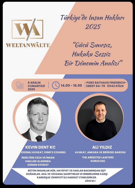 Weltanwälte e.V.’den yapılan açıklamada, etkinliğin özellikle son yıllarda Türkiye’de ağırlaşan insan hakları ihlallerine dikkat çekmek amacıyla düzenlendiği belirtildi. Human Rights Watch ve Amnesty International’ın 2025 raporlarında Türkiye’ye dair raporlarında öne çıkan başlıklar arasında siyasi muhaliflere, gazetecilere, akademisyenlere ve özellikle Kürt kökenli vatandaşlara yönelik keyfi gözaltılar, uzun süreli tutukluluklar, işkence iddiaları ve adil yargılanma hakkının sistematik olarak ihlal edilmesi yer alıyor. Örgütlerin verilerine göre Türkiye, Freedom House’un 2025 demokrasi endeksinde 100 üzerinden sadece 33 puan alarak “özgür olmayan ülkeler” kategorisinde bulunuyor.