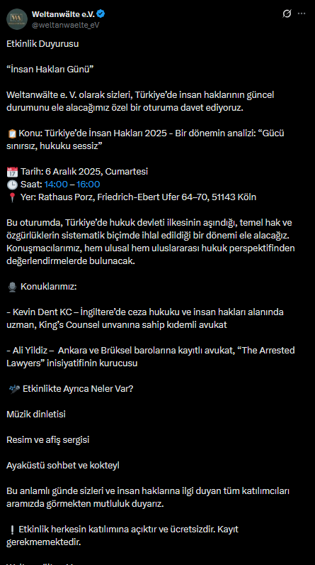 Köln merkezli insan hakları örgütü Weltanwälte e.V., 6 Aralık 2025 Cumartesi günü “İnsan Hakları Günü” dolayısıyla önemli bir etkinliğe ev sahipliği yapacak. Porz Bölge Belediye Binası’nda (Rathaus Porz) saat 14.00’te başlayacak ve tamamen ücretsiz olan programda konuşmalar, müzik dinletisi, fotoğraf sergisi ve networking imkânı bulunacak.