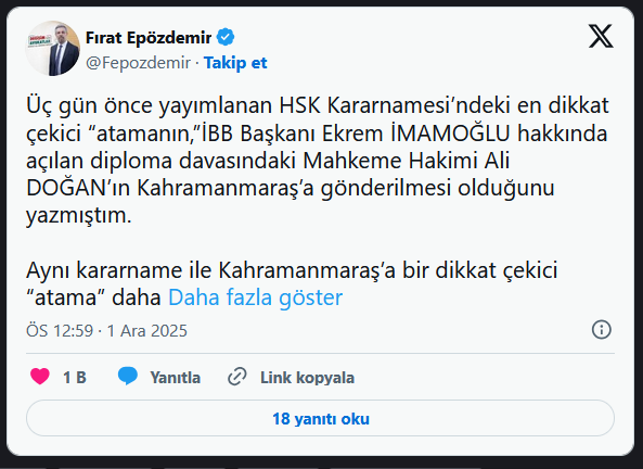 “Üç gün önce yayımlanan HSK Kararnamesi’ndeki en dikkat çekici ‘atamanın’ İBB Başkanı Ekrem İmamoğlu hakkında açılan diploma davasındaki Mahkeme Hakimi Ali Doğan’ın Kahramanmaraş’a gönderilmesi olduğunu yazmıştım. Aynı kararname ile Kahramanmaraş’a bir dikkat çekici “atama” daha yapılmış: İBB Başkanı Ekrem İmamoğlu’nun “ihaleye fesat karıştırma” iddiası ile Büyükçekmece 10. Asliye Ceza Mahkemesinde yargılandığı davada beraat kararı veren Mahkeme Hakimi Şevki Yılmaz da Kahramanmaraş’a ‘atanmış.’ Ekrem İmamoğlu davasını tarafsız bir şekilde yürütüp, vicdani kanaatlerine göre hareket eden iki hakimin de Kahramanmaraş’a ‘atanmış’ olması çok büyük tesadüf olmuş!"