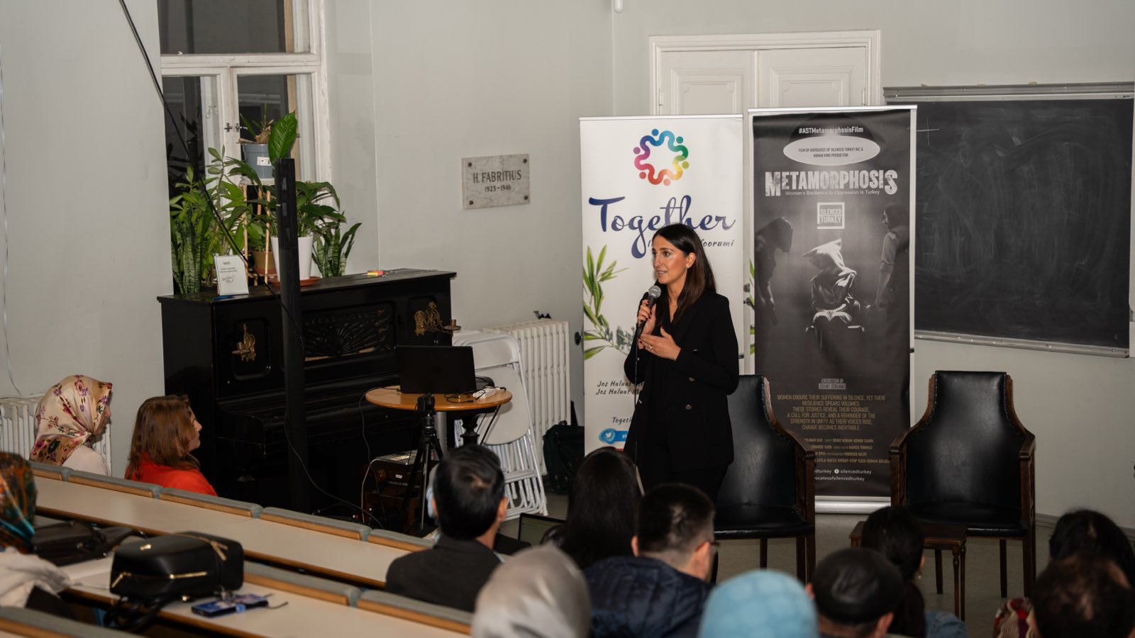 Kas’ın konuşmasının ardından, İngilizce altyazılı hazırlanan yaklaşık 1 saatlik Metamorfoz belgeseli izleyicilerle buluştu. Belgesel, Türkiye’deki kadınların özgürlük, eşitlik ve kimlik mücadelesine dair çarpıcı görüntülerle büyük beğeni topladı. İzleyiciler 1 saat boyunca duygusal anlar yaşarken gösterim boyunca tam bir dikkatle ekran başında oldular.