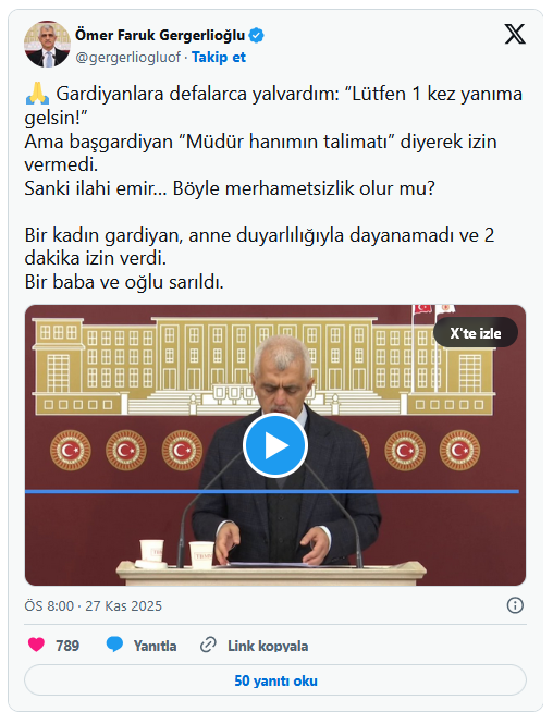 DEM Parti Milletvekili Ömer Faruk Gergerlioğlu, baba Latif Keklik tarafından kendisine iletilen mesajı X hesabından yayımlayarak konuya dikkat çekti. Gergerlioğlu paylaşımında, kararın insani olmadığı ve çocuğun duygusal olarak zorlandığı görüşünü dile getirdi.
