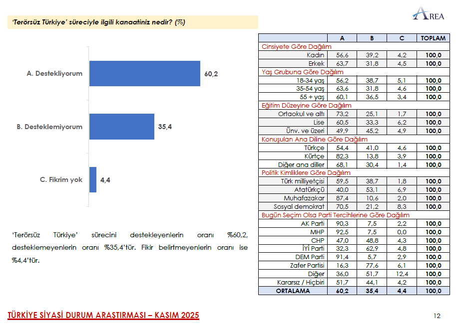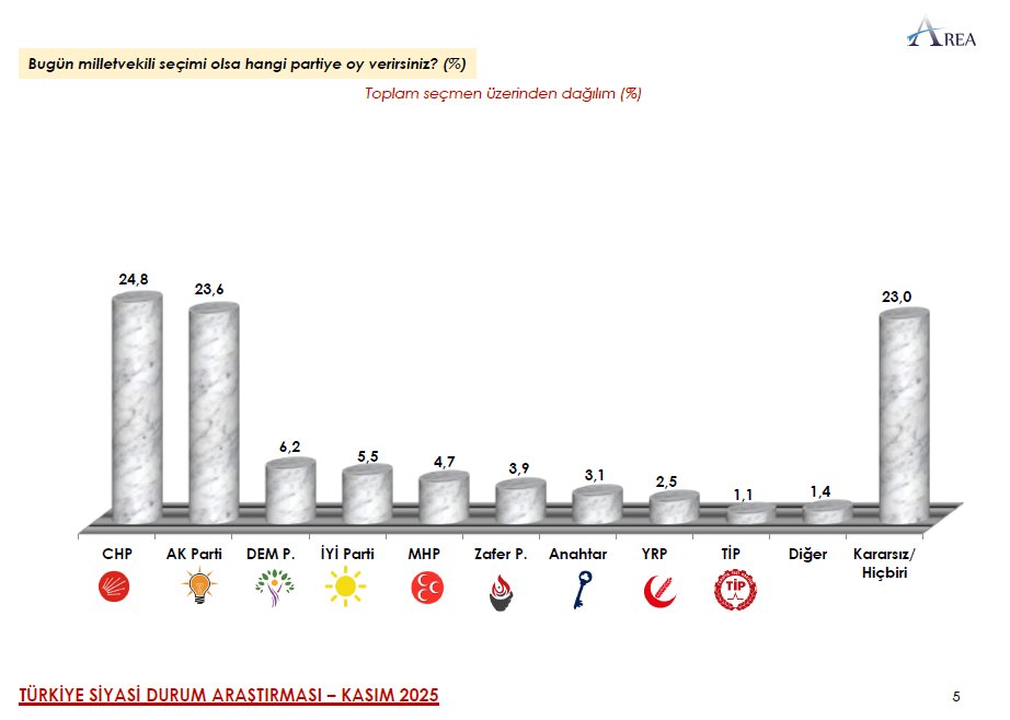 AREA Araştırma’ya göre bugün seçim olsa CHP yüzde 24,8 ile birinci, AKP yüzde 23,6 ile ikinci parti konumunda; kararsızların oranı ise yüzde 23. “Terörsüz Türkiye” sürecini yurttaşların yüzde 60,2’si desteklerken, TBMM komisyonunun Öcalan’ı İmralı’da ziyaretine yüzde 65,7 oranında karşı çıkılıyor; CHP’nin heyete katılmama kararını yüzde 54,8 olumlu buluyor.