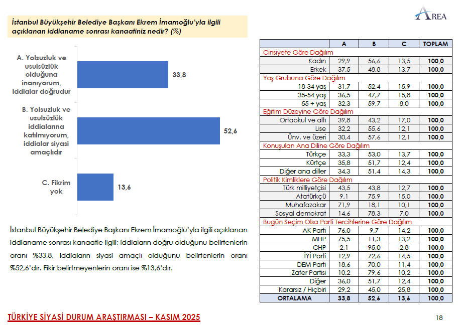 İBB’ye yönelik operasyonlarda İmamoğlu’na yöneltilen suçlamaları yurttaşların yüzde 52,6’sı “siyasi” görüyor; yüzde 82,1 ise yargılamanın TRT’de canlı yayınlanmasını istiyor.