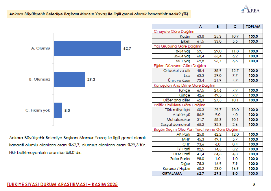 AREA Araştırma, kasım ayının “Türkiye Siyasi Gündem Araştırması” raporu kapsamında yapılan anket sonuçlarını yayınladı. “Milletvekili seçimi olsa hangi partiye oy verirsiniz?” sorularını yanıtlayan katılımcılar, yüzde 24,8 oy oranıyla CHP’yi birinci sıraya taşıdı. CHP’yi yüzde 23,6’lık oy oranıyla AKP takip etti.