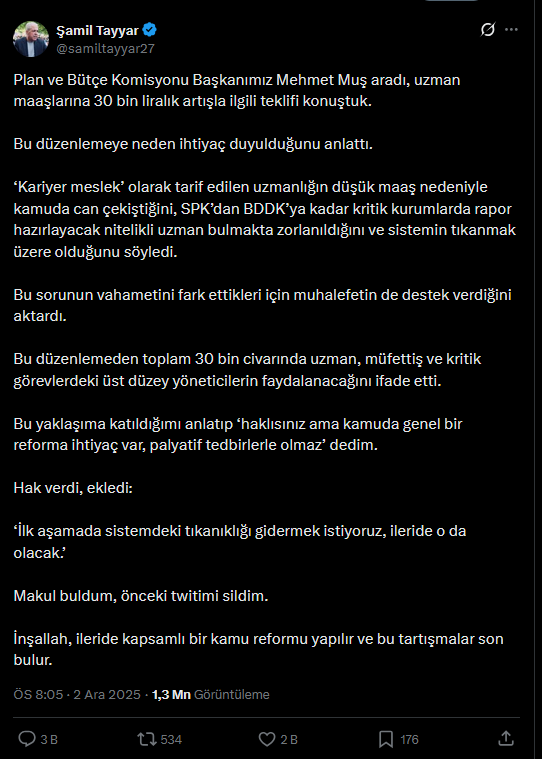 Plan ve Bütçe Komisyonu Başkanımız Mehmet Muş aradı, uzman maaşlarına 30 bin liralık artışla ilgili teklifi konuştuk.