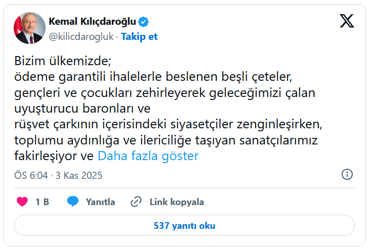 Söz konusu paylaşımda Kılıçdaroğlu, iktidara sert eleştirilerde bulundu. Kılıçdaroğlu şunları yazdı: