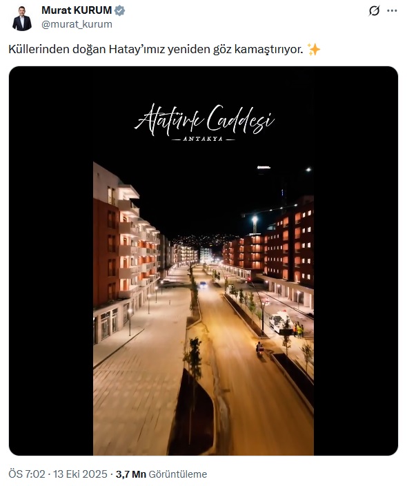 Bakan Murat Kurum, 13 Ekim tarihinde Hatay’da Atatürk Caddesi’nde inşa edilen binaları X hesabından paylaştı. Kurum paylaşımına, “Küllerinden doğan Hatay’ımız yeniden göz kamaştırıyor” notunu düştü.